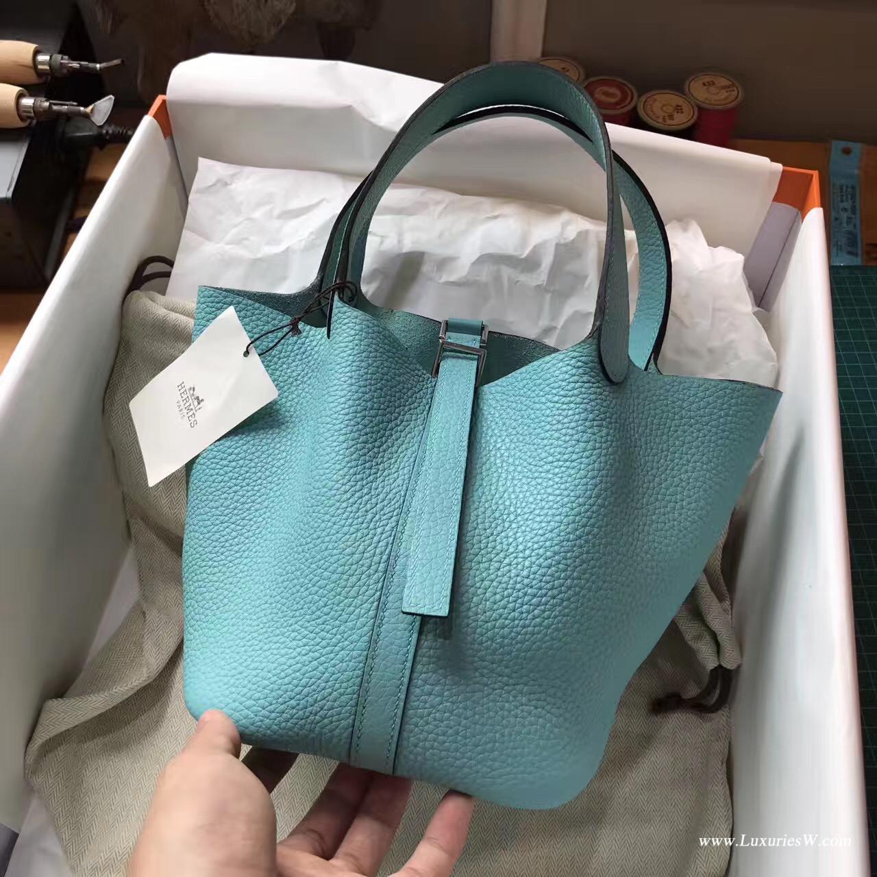 愛馬仕Hermes 鎖頭包 Picotin Lock 18cm 菜篮子 3P Blue Atoll马卡龙蓝 粉嫩粉嫩蓝色。愛馬仕最不同的包袋鎖頭包(Picotin Lock)又名菜籃子,采用簡潔大方的桶型設計,非常具有立體感,長得有點像中國80年代的菜籃子,因此被網友親切地稱為菜籃包。選用Taurillon小牛皮制成,柔軟,耐磨,防水性能非常的好。