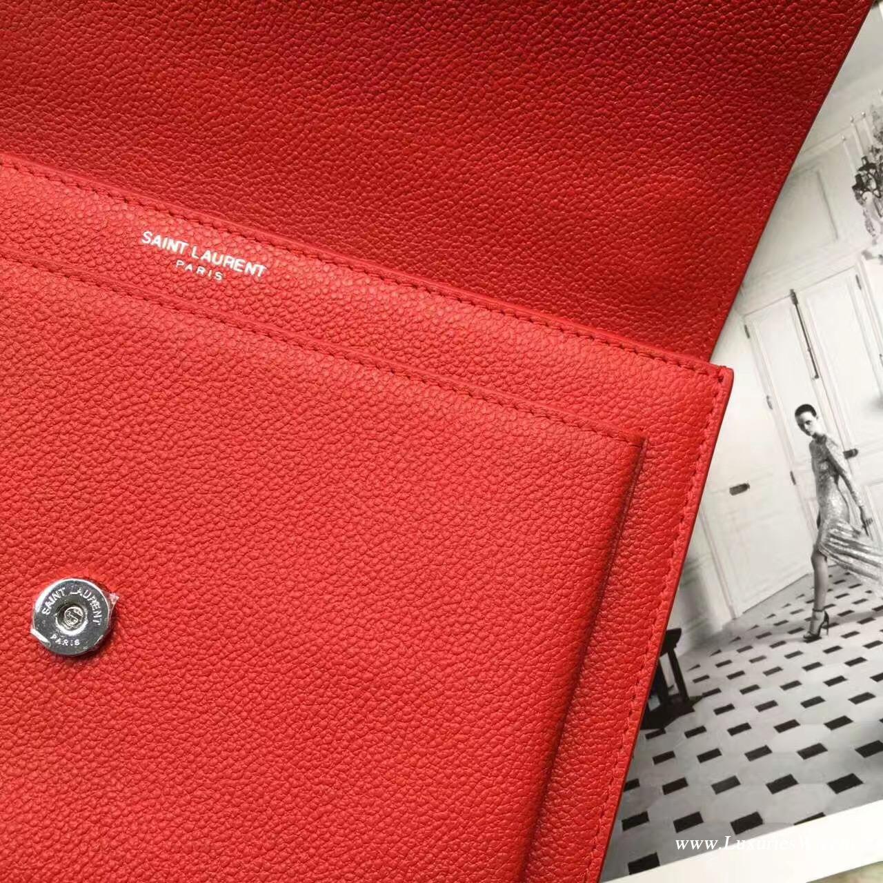 聖羅蘭YSL 中號大紅色SUNSET MONOGRAM SAINT LAURENT挎包,前翻蓋包,側面風琴褶、可拆卸和可調節真皮肩帶、真皮包邊鑰匙圈和金屬聯結YSL標誌。