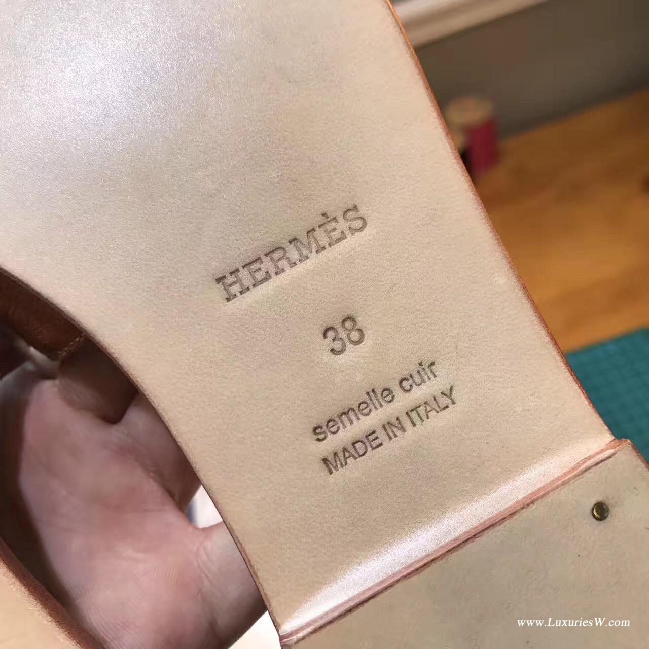 愛馬仕Hermes 經典款女士涼鞋 H型拖鞋 鴕鳥皮 CK37 Gold金棕色 中跟,平底涼拖鞋