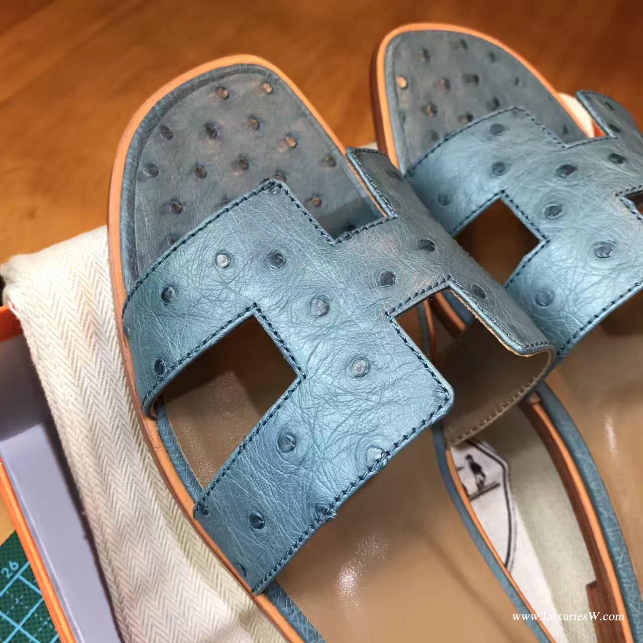 愛馬仕Hermes女士涼鞋 H型拖鞋 鴕鳥皮 3P Blue Atoll 馬卡龍藍平底涼拖鞋