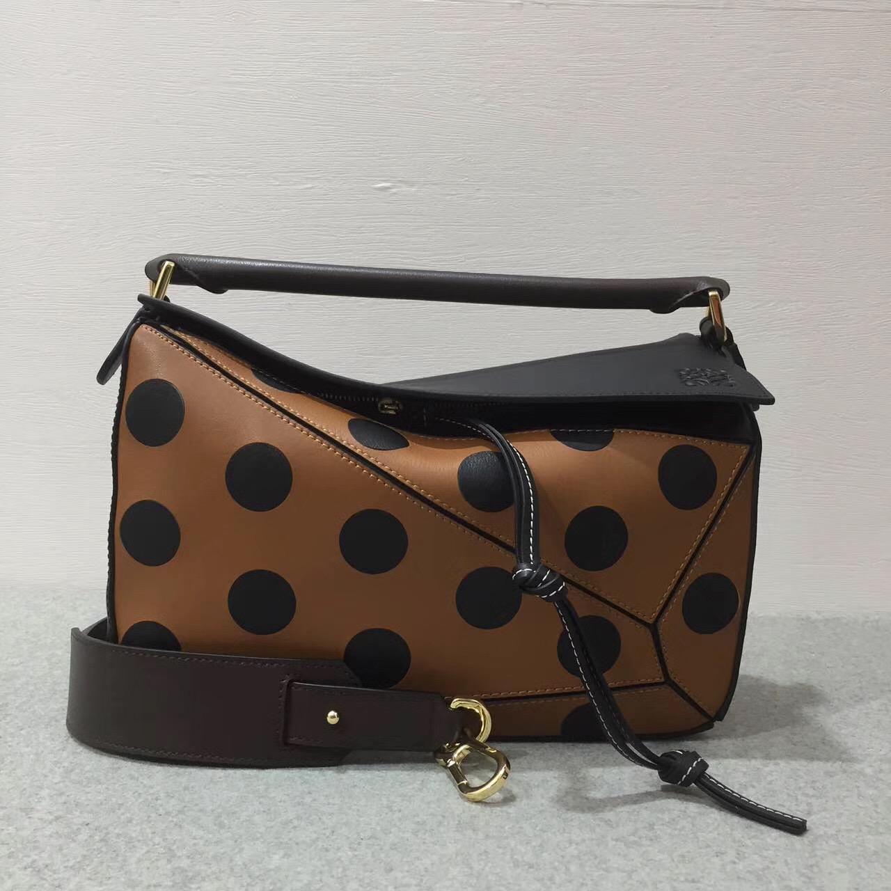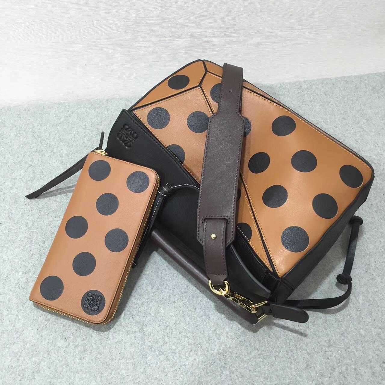 The first completely new bag designed by Jonathan Anderson has become a LOEWE icon. With its innovative cuboid shape, extreme tactility and maximum utility, volume is created through precise cutting so the Puzzle bag can be worn in five different ways, from shoulder bag to clutch and folds completely until it´s flat. Graphic bold circles crafted in leather marquetry add playfulness to the bag. Key characteristics: tricolor, hand-painted edges; textile lining and two pockets inside. Removable adjustable strap for the most comfortable length