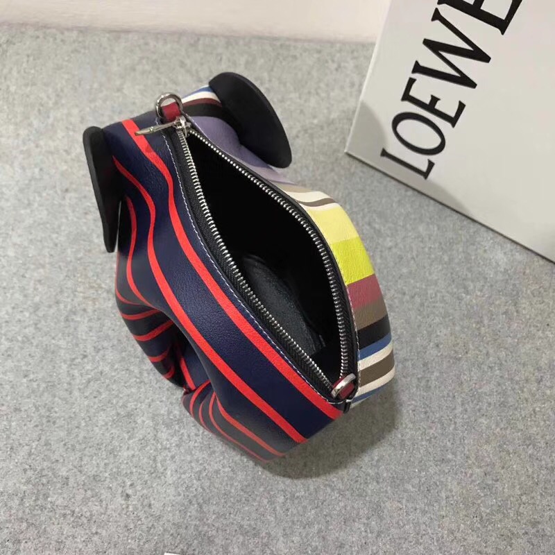 Loewe推出俏皮可愛的大象造型迷妳手袋系列,選用小牛皮制成,飾有不同大小的彩色條紋。配有可調包帶,更飾有長鼻子和穿孔眼睛細節。主要特點:黑色漆邊,拋光銀色金屬配件,可拆卸的皮革平包帶,拉鏈包口。