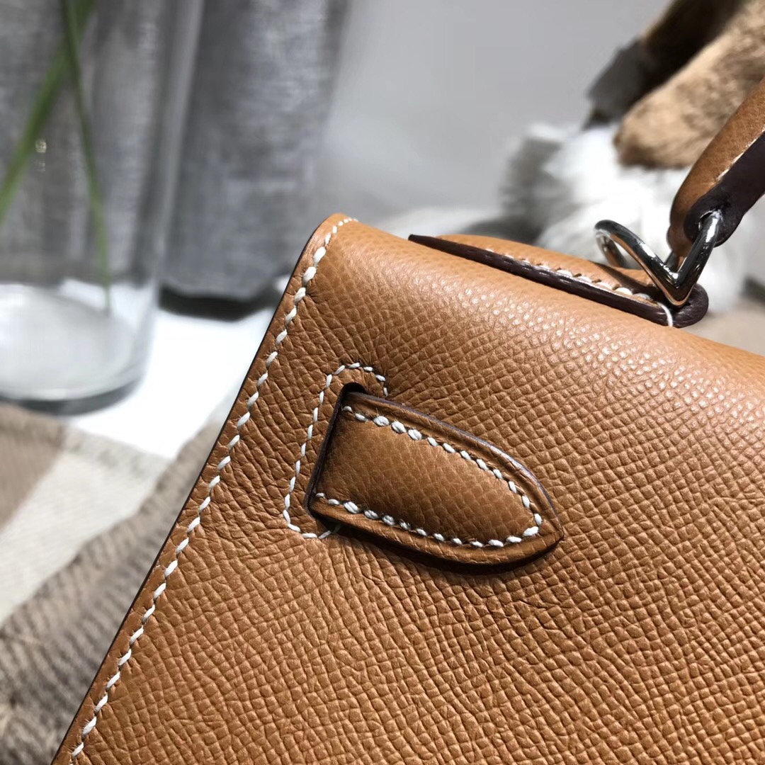 愛馬仕凱莉包Hermes Kelly 28cm Epsom CK37 Gold金棕色 銀扣金屬 外縫 經典百搭白色線手工蜜蠟線縫制
