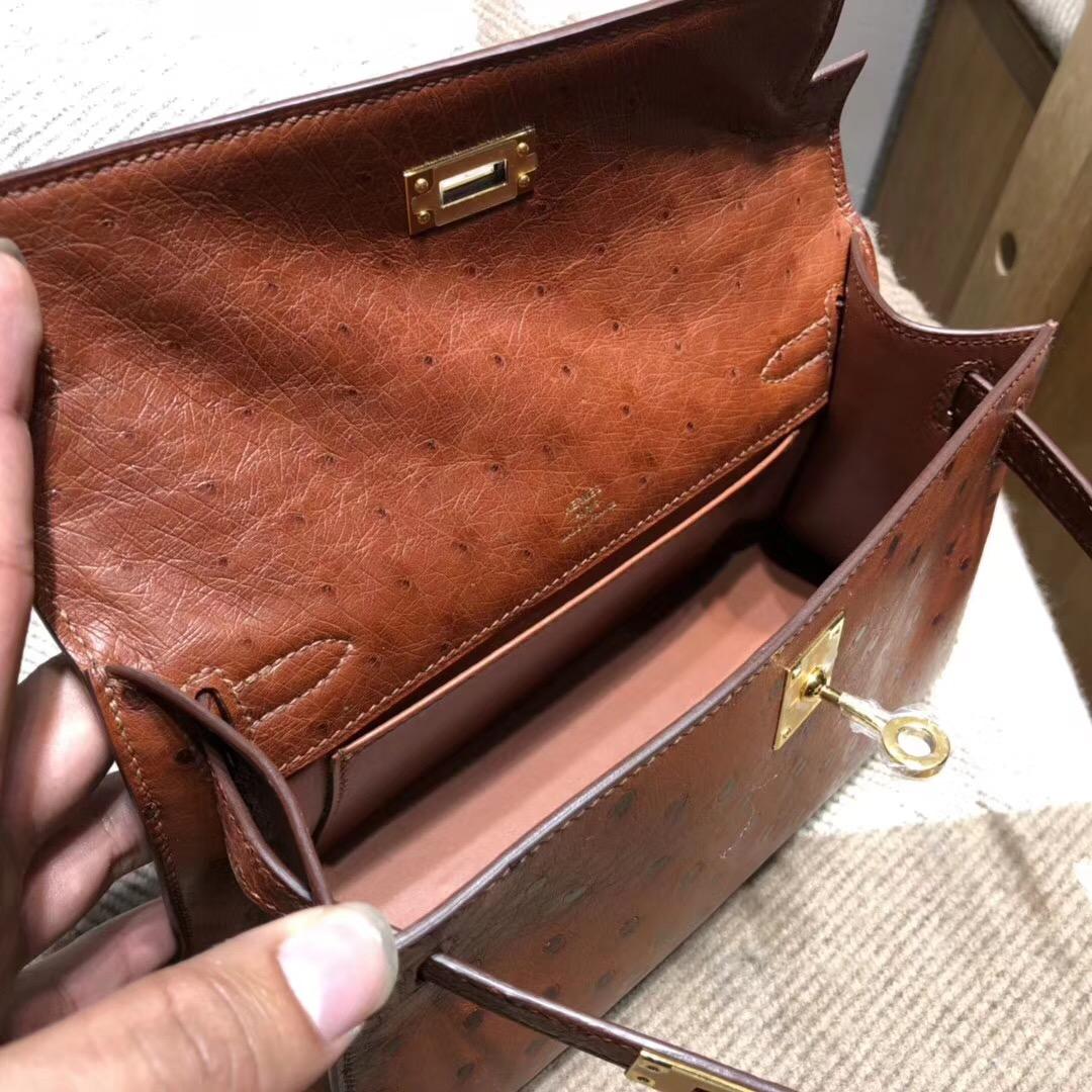 愛馬仕Hermes Mini kelly 鸵鸟皮 OSTRICH 4G 焦糖色 brulee 比金棕色更深的颜色 金扣銀扣金屬
