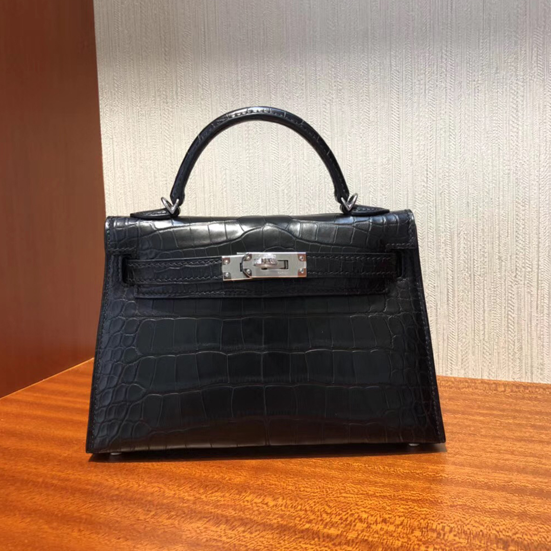 愛馬仕凱莉包2代 Hermes miniKelly二代 CK89黑色 霧面方塊美洲鱷魚 Matte alligator crocodile 銀扣金屬 全手工蠟線縫