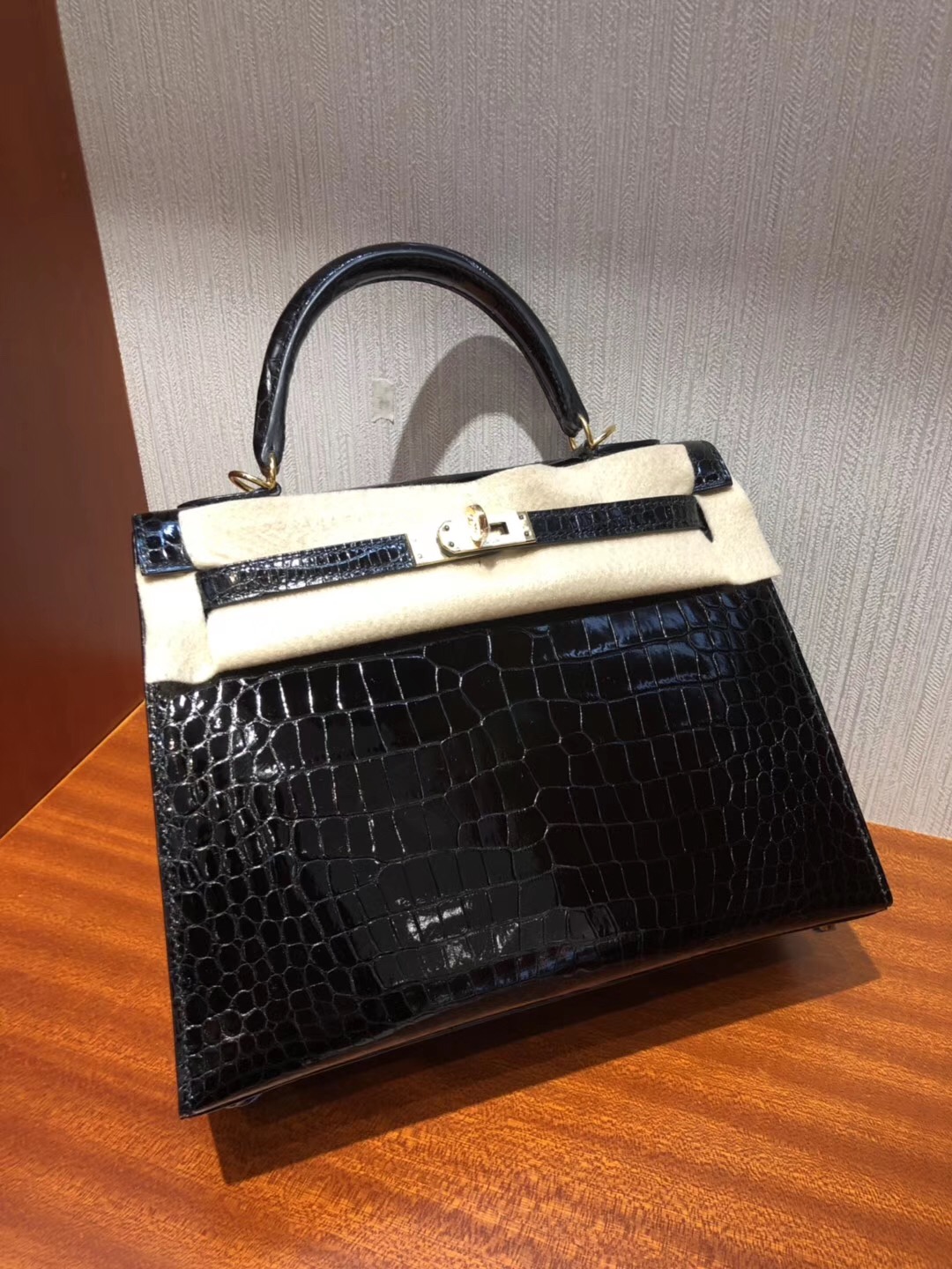 新加坡 愛馬仕旗艦店 Singapore Hermès Kelly 25cm HCP亮面倒V 野生灣鱷 Shiny porosus crocodile CK89黑色 金扣