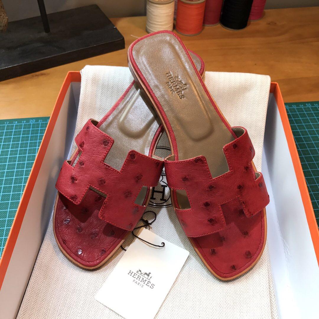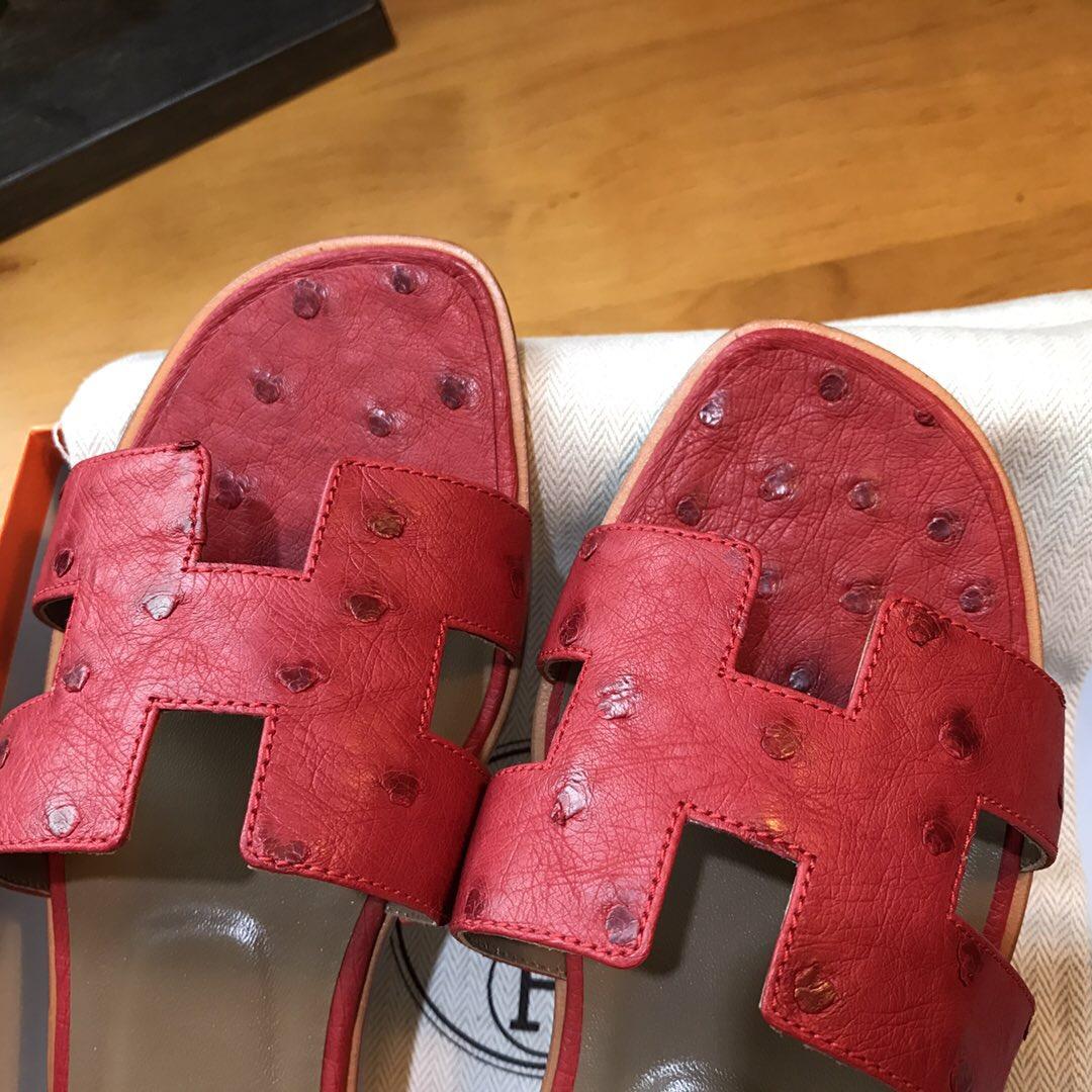 愛馬仕Hermes 經典款女士涼鞋 H型拖鞋鴕鳥皮 Ostrich leather Q5國旗紅 Rouge Cossacks 中跟,平底涼拖鞋