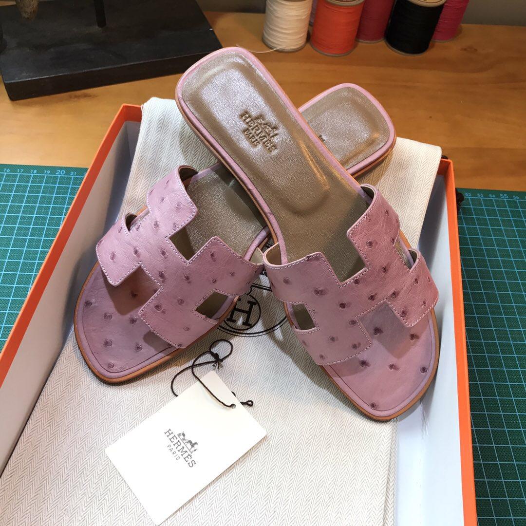 愛馬仕Hermes 經典款女士涼鞋 H型拖鞋鴕鳥皮 Ostrich leather CC94陶瓷粉 Terre Cuite 中跟,平底涼拖鞋