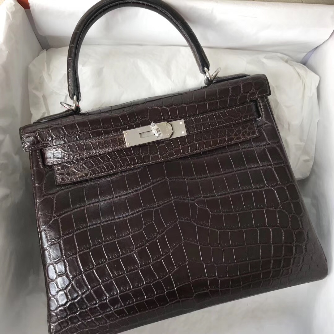 臺灣臺中愛馬仕凱莉包 Hermes Kelly 28cm CK47巧克力色 霧面兩點 尼羅鱷魚 Matte nilo crocodile 銀扣金屬 全手工蠟線縫制