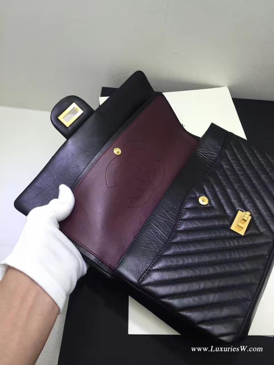 小香經典款女包大號2.55口蓋包V型復古小牛皮與釕色金屬黑與酒紅