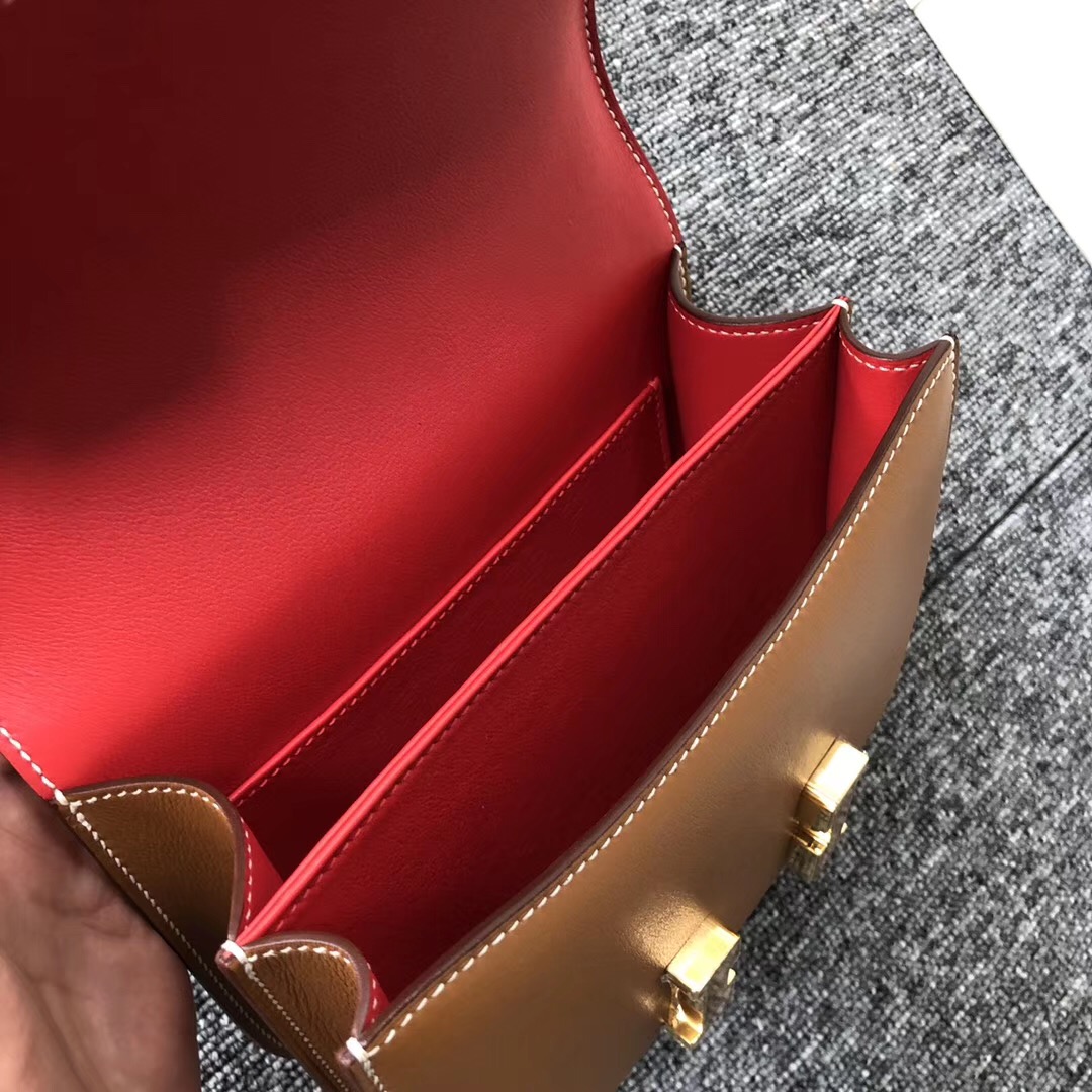 香港愛馬仕空姐包 臺灣官網價格 Hermes Constance 19cm Swift CK37 金棕色 Gold 內拼S5番茄紅 Rouge Tomate 金扣 客定出貨 全手工蠟線縫制