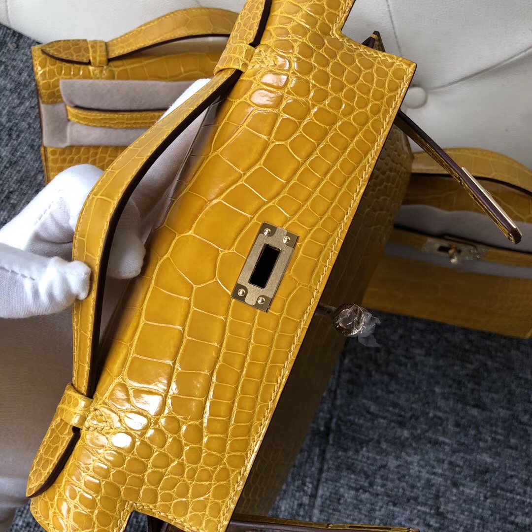 澳洲愛馬仕迷妳凱莉壹代 Australia Hermes MiniKelly 22cm 9D琥珀黃 Amber 亮面方塊 美洲鱷魚 Shiny alligator crocodile 全手工蠟線縫 金扣