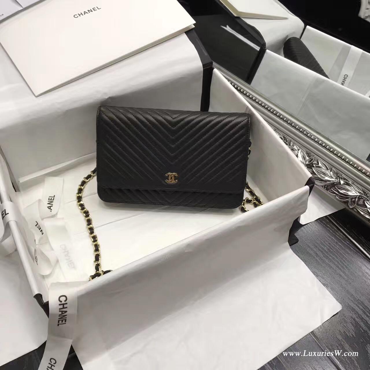 Wallet On Chain V型 小羊皮经典款黑色 金色五金