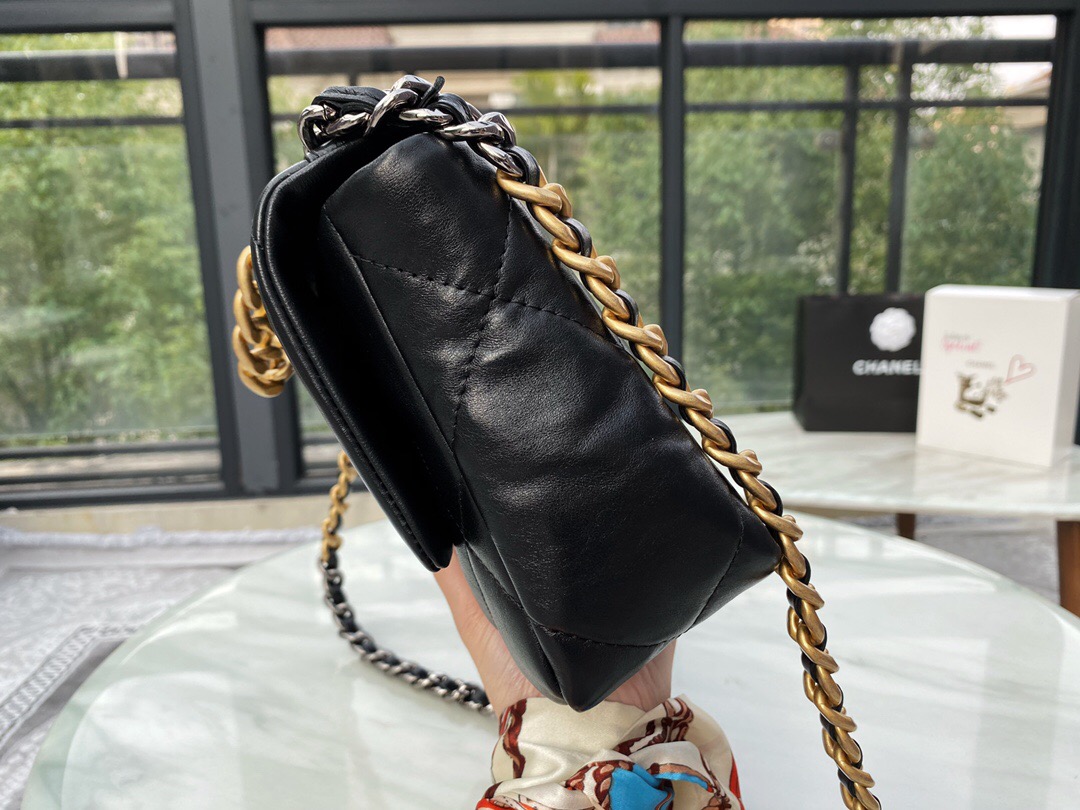 香港香奈兒包包 CHANEL 19小號口蓋包黑色 山羊皮、金色金屬、銀色金屬與釕色金屬