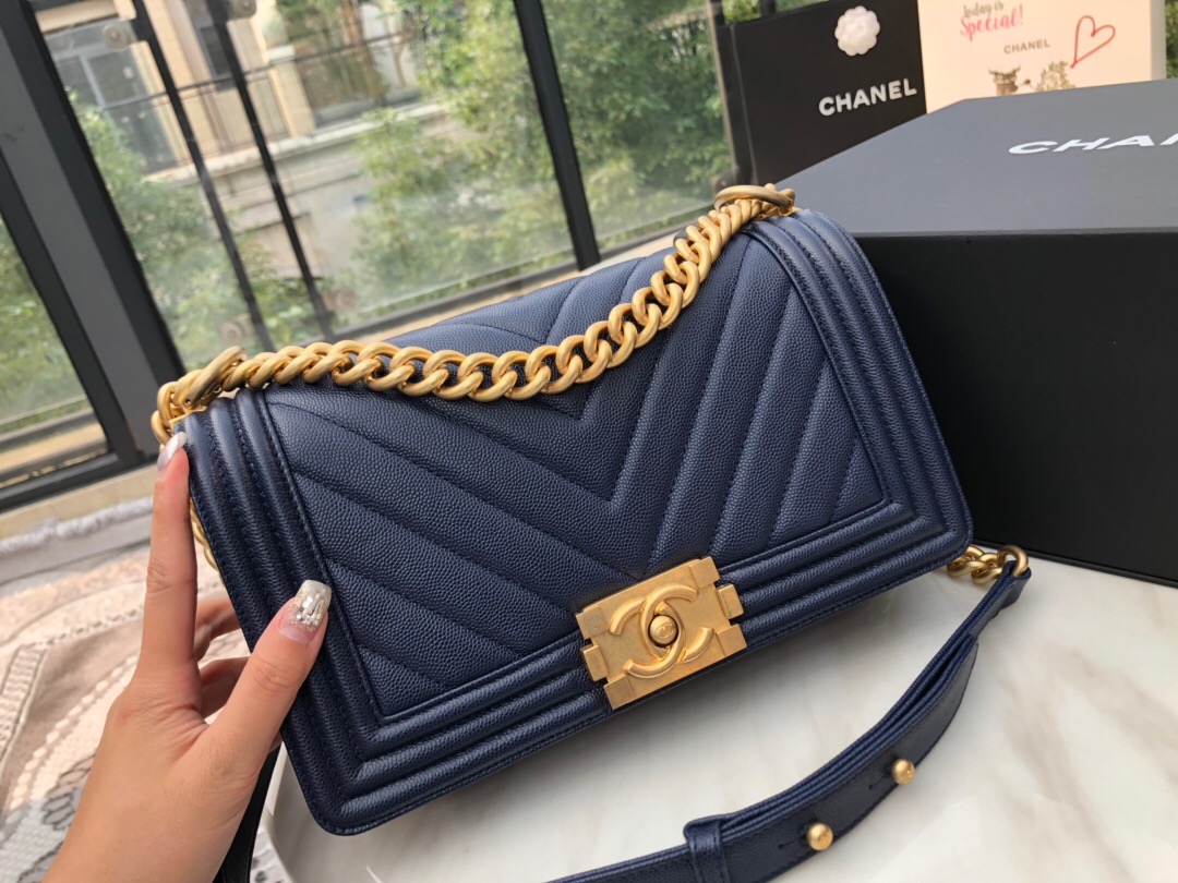 香奈兒 HAAS 深蓝色小牛皮 Le boy bag 口蓋包V型車縫線 沙金五金金屬
