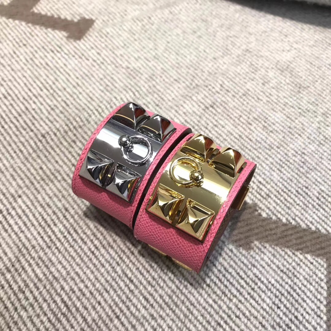 愛馬仕Hermes手鐲 朋克風kelly寬款手鐲 鉚釘CDC Epsom皮 U5 Rose Lipstick唇膏粉色 金银扣手环