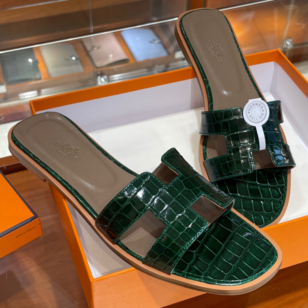 愛馬仕經典款女士涼鞋 鱷魚皮 H型拖鞋Hermes Oran涼鞋 67 Vert Fonce 祖母綠 平底涼拖鞋 全手工蜜蠟線縫製